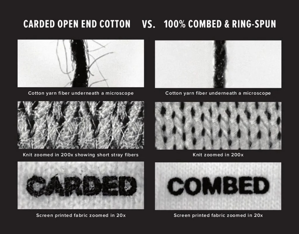 Combed Ringspun cotton is the step up from regular Ringspun cotton. This is starting to become an industry standard when it comes to higher-end clothing with brands like Bella+Canvas and American Apparel only using this type of cotton. The difference between Combed Ringspun and regular Ringspun/Softspun is that the raw cotton has undergone a refining, or “combing” process that eliminates any impurities. Essentially, any extra bits of plant fibre that may still be lingering in regular Ringspun cotton is completely gone in Combed Ringspun. This creates a super soft feel, stronger fibres, smoother printing surface, and helps it hold up the t-shirt better after washing. This type of cotton works great with both Screen Printing and Direct-to-Garment printing.
