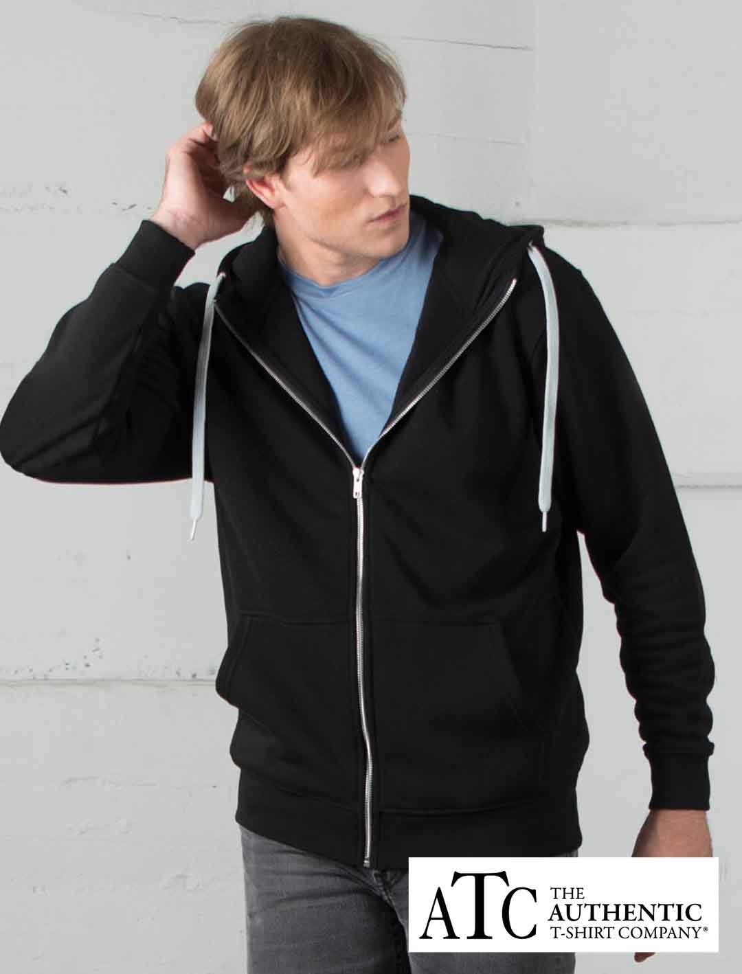 ATC is a great standard brand. It’s goal is to provide you with a reasonable quality hoodie at a budget price. The fabric on this hoodie is heavy weight and the zipper is metal. The drawstring is a shoelace type and it is contrasting. Usually it is white.